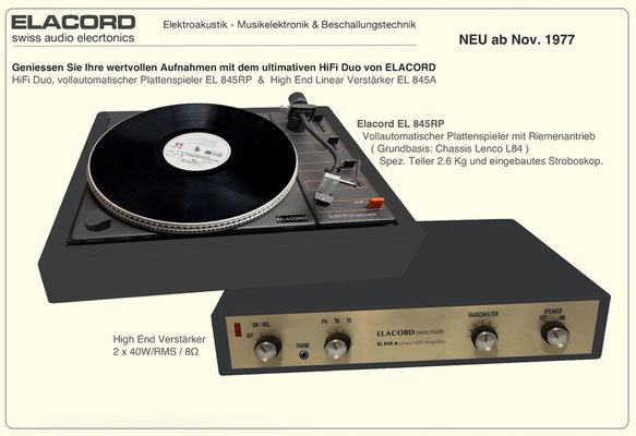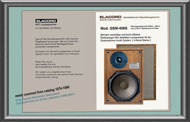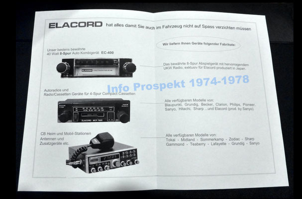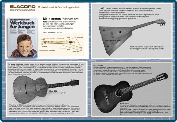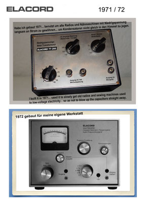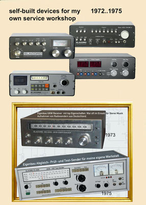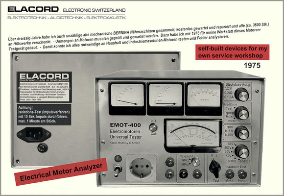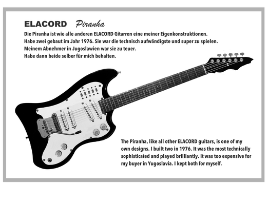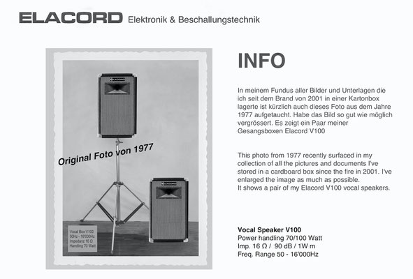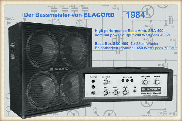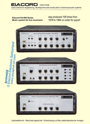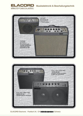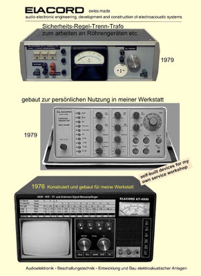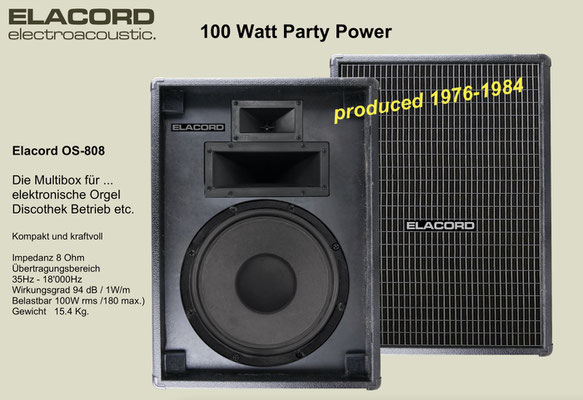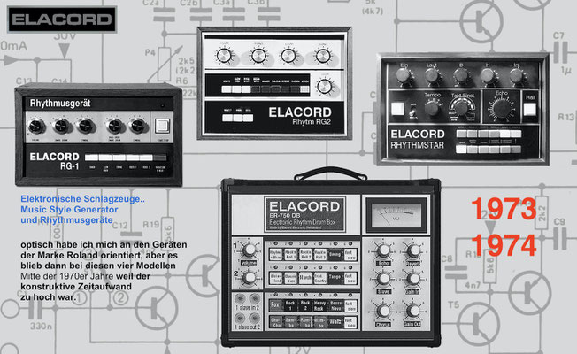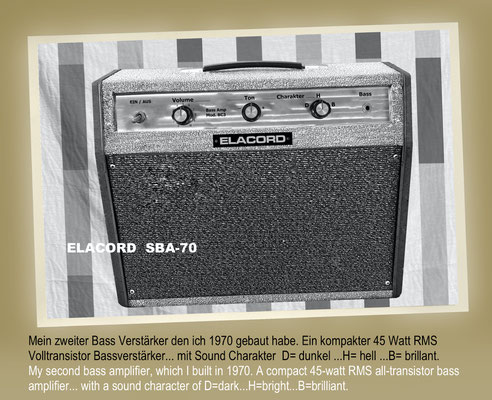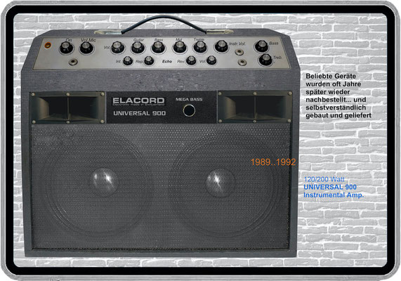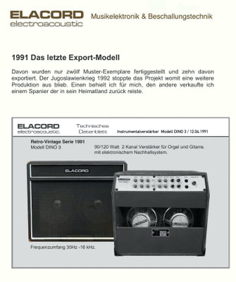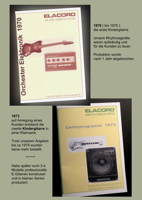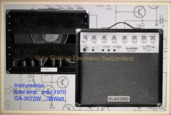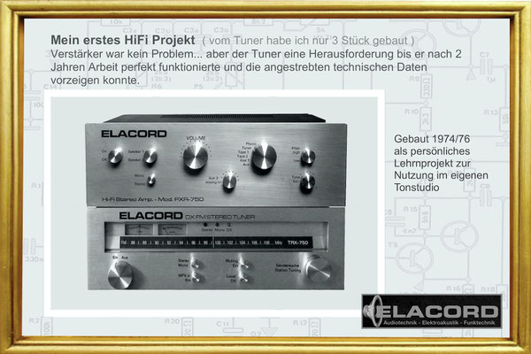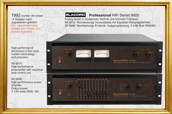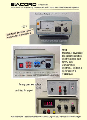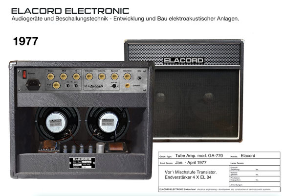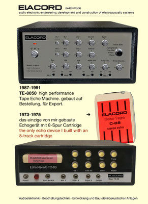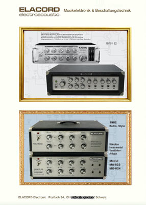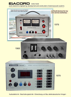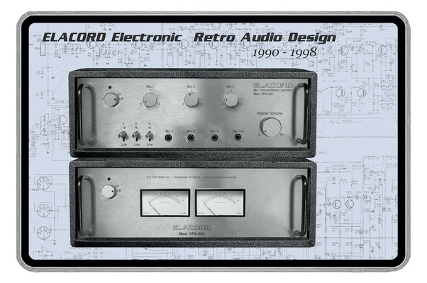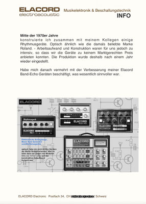 1968-2001 Die ersten Modelle meiner Musikgeräte Produktion "Marke Elacord" habe ich im Herbst 1968 entwickelt und gebaut. 1971 kam unerwartet der Kontakt mit meinem zukünftigen Abnehmer in Jugoslawien zustande. In der Zukunft baute ich Musikgeräte nach meinen Ideen aber auch manche Geräte in Kleinserie auf Bestellung meines Kunden. Alle wurden nach Jugoslawien exportiert. 2001 wurde meine Werkstatt und die komplette Audio Elektronik-Sammlung von über 6000 Audio, Hifi und Musikgeräten, ca. 200 Gitarren und Tausende Bücher, Kataloge und technische Unterlagen durch Brandstifter vernichtet. - I developed and built the first models of my musical equipment production, the "Elacord" brand, in 1968. In 1971, I made contact with my future customer in Yugoslavia. In the future, I built some devices in small series to order for my customers. All were exported to Yugoslavia. In 2001, my workshop and my entire audio electronics collection of over 6,000 audio, hi-fi, and musical instruments, approximately 200 guitars, and thousands of books, catalogs, and technical documentation were destroyed by arsonists.