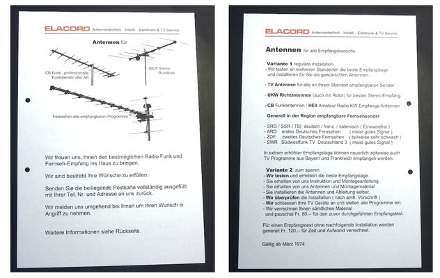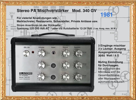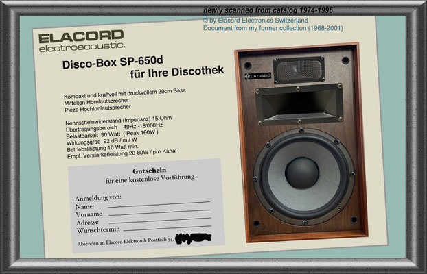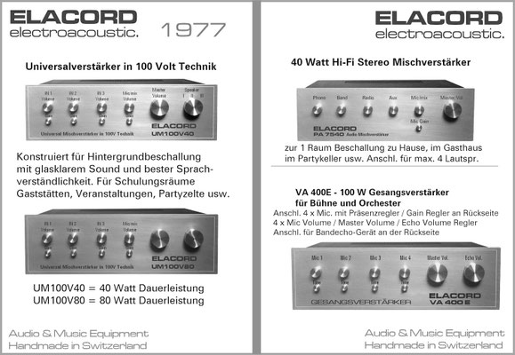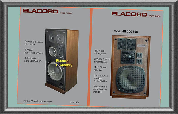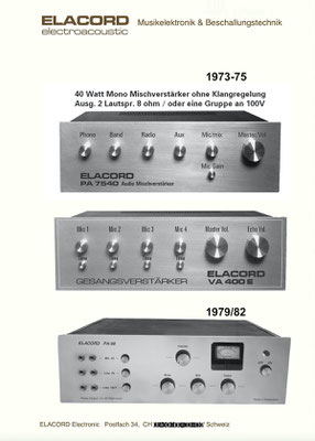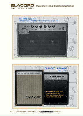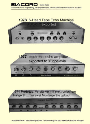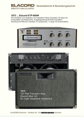 1968 I created the name ELACORD for my future music devices and speaker systems. - 1969 I began designing professional music amplifiers, echo devices, and loudspeaker systems. From 1971 I built all my devices under the Elacord brand name. Everythings was exported to Yugoslavia until 1992... but then a civil war rged there for several years (1992-1999). From one day to the next, all my business contacts broke off. My Friend and intermediary Miroslav from Croatia was "accidentally" shot dead in the chaos of the war in 1992. There was a curfew, but he didn't know that when he arrived in his city by car after 10 p.m. - the dream was over -. Now I devoted myself more to repairing and servicing electronic organs and other devices like audio and tv equioment. I collected audio and musical devices for over thirty years. In June 2001, my entire collection of over 6'300 devices was destroyed when arsonists set fire to the factory buildings that housed my workplace and all my devices during the night.